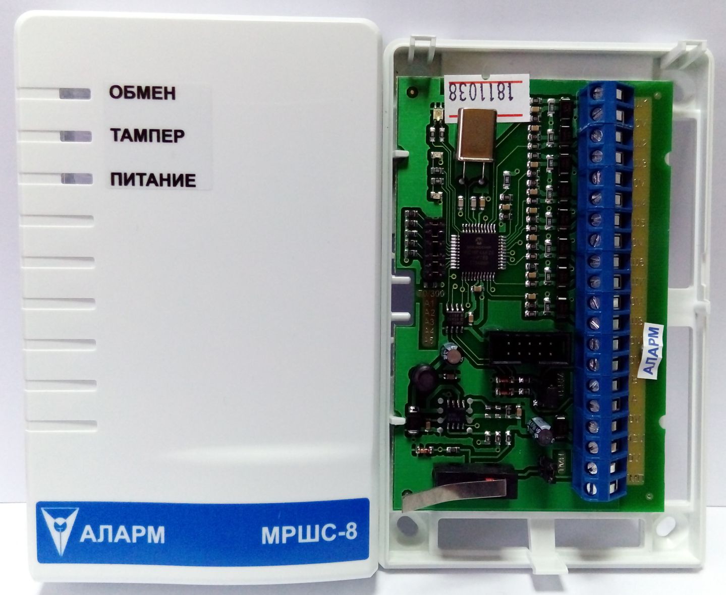 Модуль расширения шлейфов сигнализации (МРШС-8) предназначен для контроля и обмена данными по стыку RS 485 в составе прибора приемно-контрольного охранного ППКО 063-32-11 «Аларм-11», исполнение «А», «Б» (выпуска с декабря 2018 г.) . Является внешним устройством, подключаемым к приборам. Один модуль контролирует до 8-ми двухпроводных шлейфов охранной сигнализации (ШС) и передает их состояния на ППКО.